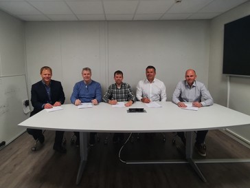 Bildetekst: Signering. Fra venstre: Gisle Kvamme (regiondirektør for Bravida Norges region Vestland), Arvid Myhra (eier Bautec AS), Øystein Fykse (eier Bautec AS), Ronny Øvrevik (divisjonsdirektør for Bravida Norges divisjon Kysten) og Tore André Hauge (eier og daglig leder Bautec AS).